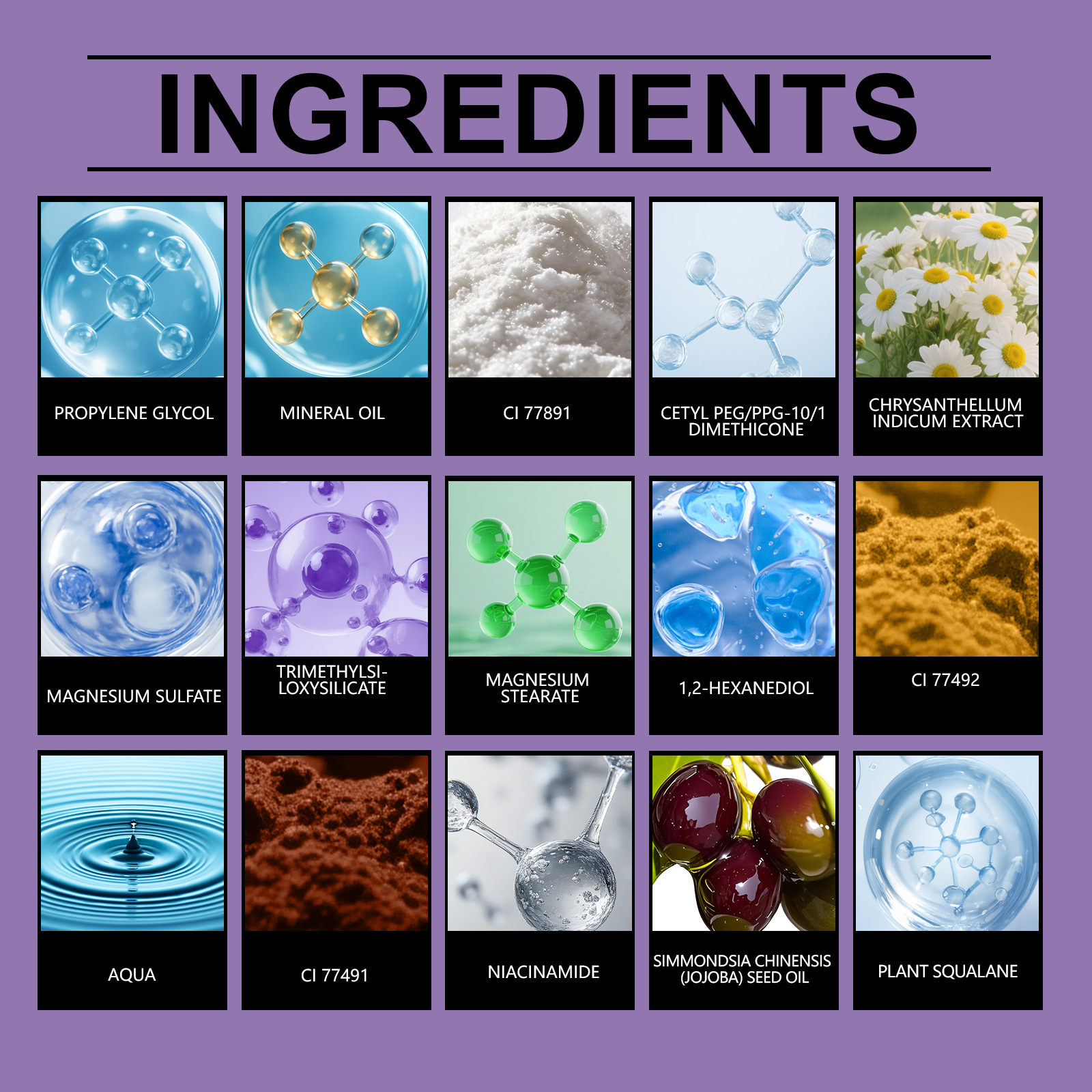 Ingredients: water, propylene glycol, mineral oil, CI 77891, cetyl PEG/PPG-10/1 polydimethylsiloxane, magnesium sulfate, trimethoxysiloxane silicate, magnesium stearate, 1,2-hexanediol, CI 77492, CI 77491, nicotinamide, chamomile extract, jojoba seed oil, plant squalane.